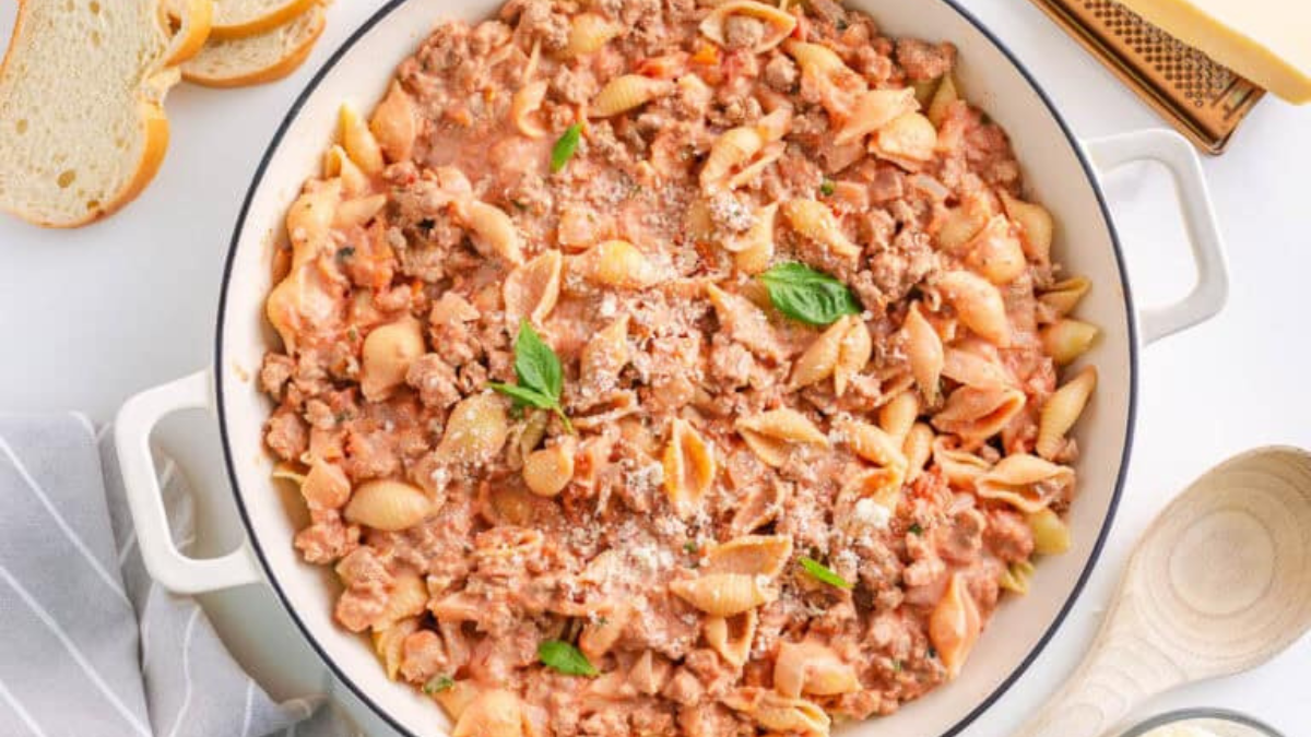 This easy Creamy Beef and Shells recipe comes together in under an hour and uses just a few simple ingredients. Tender pasta shells, seasoned ground beef, and a rich, creamy tomato sauce, finished with cheddar and parmesan, make this a cozy, satisfying dinner perfect for waiting for the ball to drop.